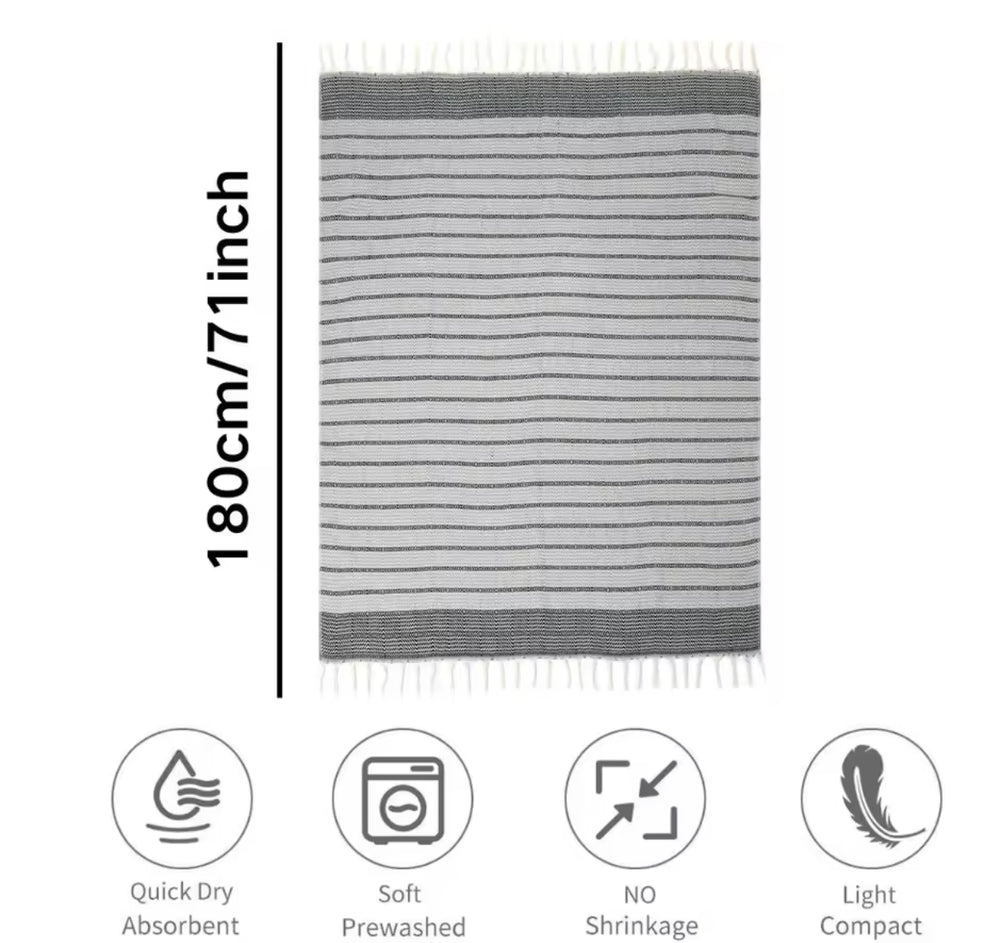 Black \ Gray Bath and Beach Towel are soft, versatile, lightweight, and eco-friendly textile that offers a myriad of uses while remaining gentle on your skin and the environment. Its quick-drying and breathable features make it a practical choice for a wide range of activities, from personal care to outdoor adventures, all while promoting sustainable and responsible consumption.