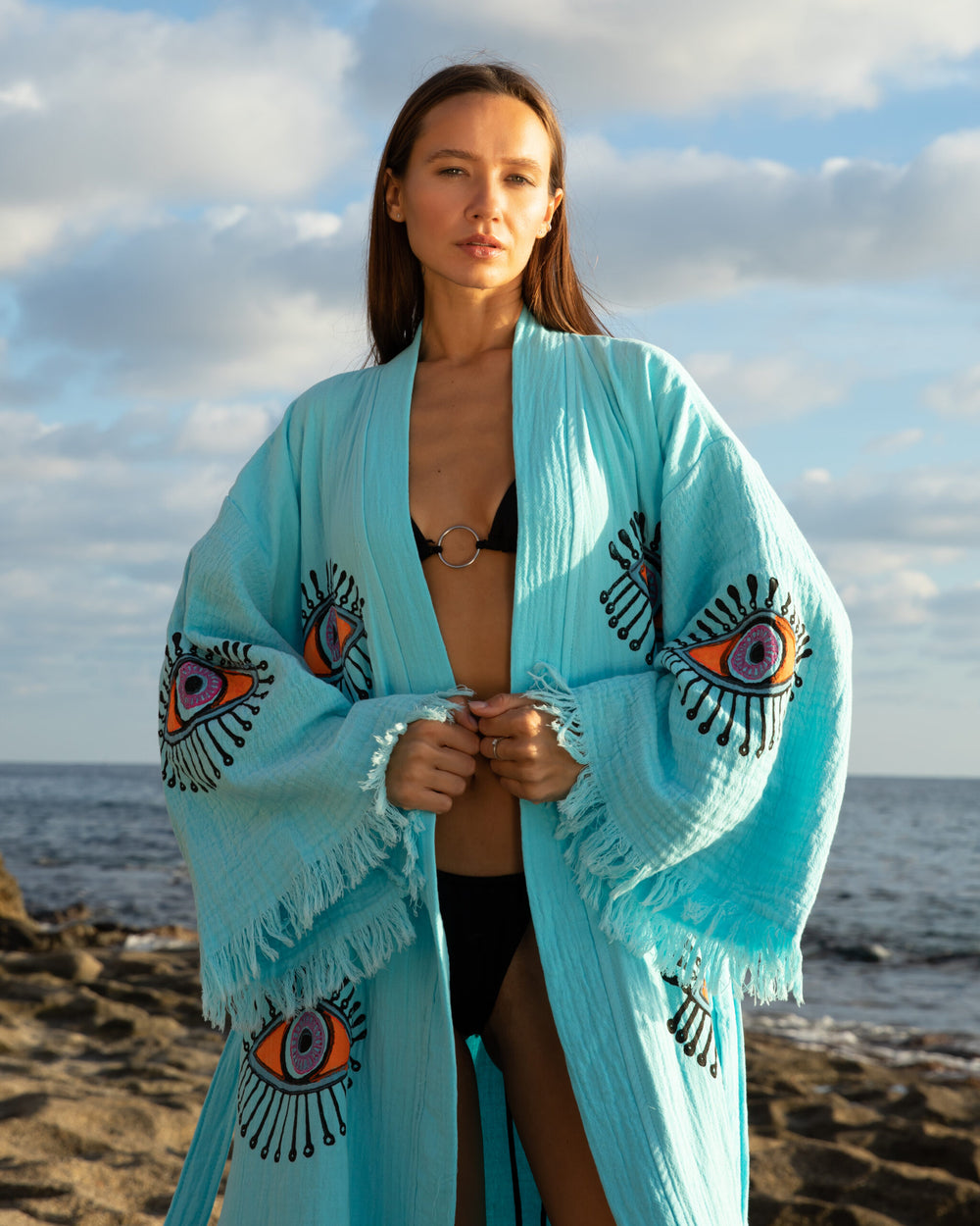 Handmade evileye design, Organic Turkish Cotton Robe that’s soft, cozy, lightweight, quick-drying, and eco-friendly offers a delightful combination of comfort, practicality, and sustainability.