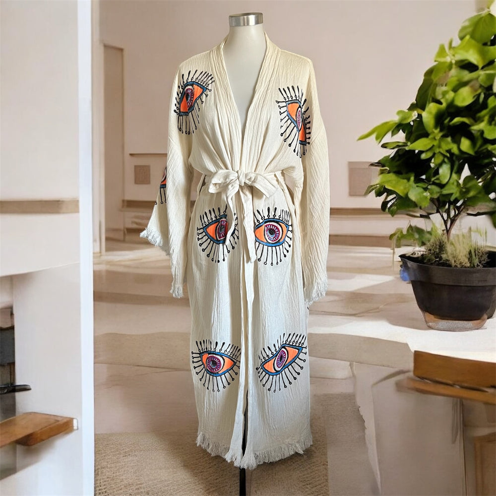 The Handmade Turkish Cotton+Bamboo+Muslin Robe - Kimono with Evil Eye is crafted from a luxurious blend of Turkish cotton, soft bamboo, and lightweight muslin. This combination of materials ensures breathability and provides a gentle touch against the skin, contributing to its overall comfort and elegance.