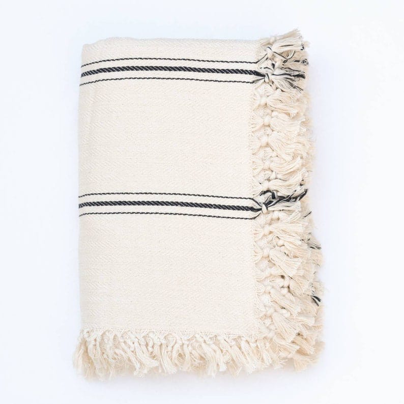 This soft and cozy throw blanket, with its cream striped pattern, is the perfect addition to any couch or bedspread.