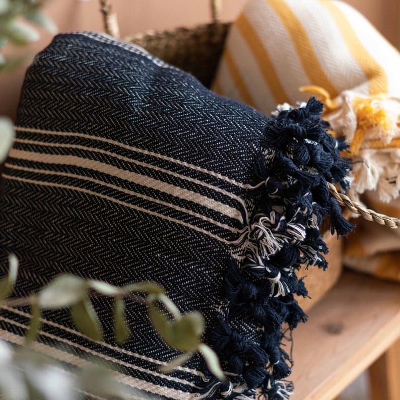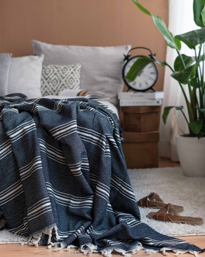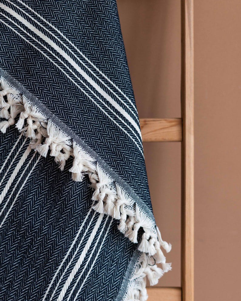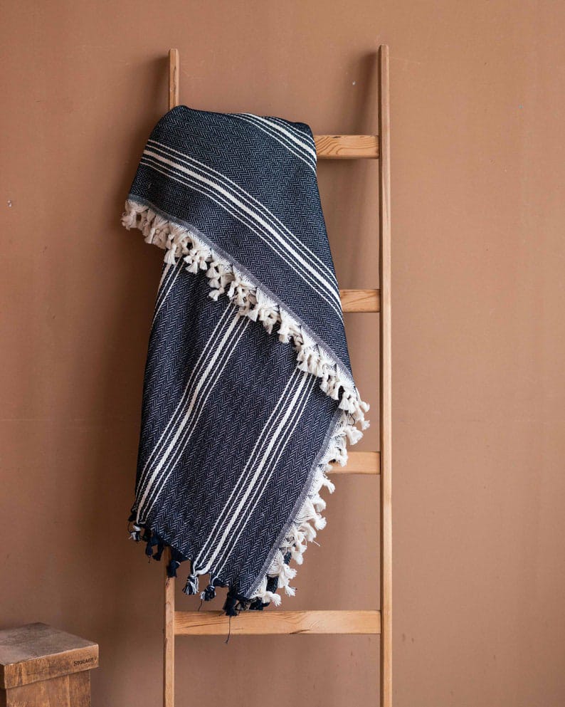 This soft and cozy throw blanket, with its navy and cream striped pattern, is the perfect addition to any couch or bedspread.
